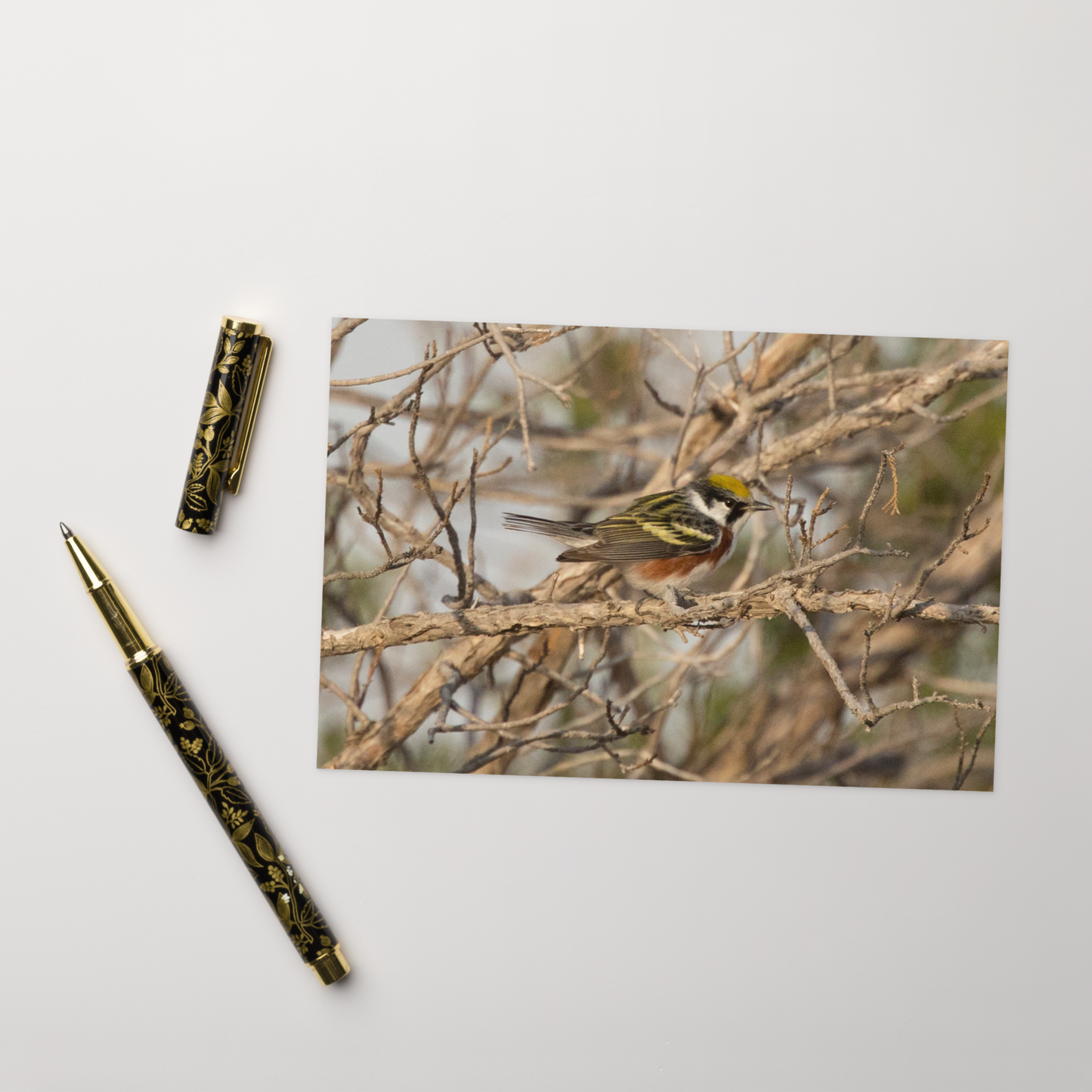 This card is blank inside. Ready for you to add a special message. The bird pictured is a Chestnut-sided Warbler. The name of the bird is detailed on the back.